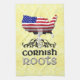 Karte der USA mit Wurzeln, und vermischte amerikanische und Cornwall Fahnen und den Text Cornish Roots darunter.