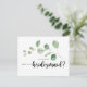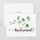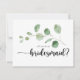 Cette carte de proposition d'eucalyptus bridesmaid est parfaite pour un simple mariage. L'aménagement comprend des branches et des feuilles d'eucalyptus botaniques élégants dessinés à la main dans des aquarelles. Changez le libellé et utilisez ces cartes pour demander à tous les membres de votre fête de mariage : bonne d'honneur, maîtresse d'honneur, demoiselle d'honneur, demoiselle d'honneur, demoiselle d'honneur junior, fille de fleurs, meilleur homme, groomsmen et plus !