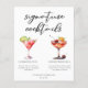 Dieses elegante Cocktails-Menü bietet eine schlichte schwarze Typografie über 2 Ihrer Lieblingsgetränke und deren Zutaten für Ihre Hochzeitsfeier an der Küste. Ein schicker Cosmopolitan und Cherry French 75 zeichnend ergänzen Ihr Bar-Menü mit einem Flair. Füllen Sie bitte die Namen des Paares und das Datum für seinen Empfang aus.
