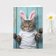 This card shows a close-up portrait of a striped tabby cat facing forward, dressed in a bright white t-shirt and a soft headband with pink-lined bunny ears 🐰. Its golden-green eyes meet yours with a curious, slightly teasing look, like a friend leaning in for a shared joke. The cat’s front paws are lifted near its chest, adding a gentle, almost hug-like pose that reads as affectionate and inviting 🐇. Behind it, vertical wooden panels form a rustic backdrop painted a faded teal-blue, with worn areas revealing warmer earthy tones underneath. Soft, diffused light highlights the detailed fur markings, long whiskers, and the small rose-colored nose at the center of the face. Near the top, the main text sits centered in a simple dark tone that stands out against the pale background. The pink inner ears on the headband contrast softly with the teal boards and the cat’s white shirt.
