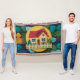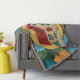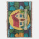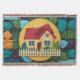 Ein faszinierendes Zuhause-Icon-Muster mit einem reizenden Haus mit rotem Dach und weißem Picketzaun. Das Haus ist eingebettet in eine gemütliche und einladende Atmosphäre, umgeben von einer Vielzahl von Texturen und Farben. Das Muster enthält eine Vlies-Decke, die das Gefühl von Wärme und Komfort verstärkt