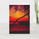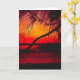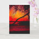 Carte blanche avec un beau coucher de soleil rouge et or, et un arbre en silhouette. Des frondes de palmiers sont accrochées dans le ciel coloré. Grande carte à envoyer à impressionner.
