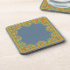 Ein Set von sehr hübschen, quadratischen, korkgestützten Untersetzer oder Drink Mats, mit einem Rand von Pot Marigold Blume auf einem Indigo-Hintergrund. Teil der Posh & Painterly 'Marigold Medley' Kollektion.