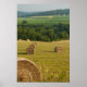 The scenic Countryside Hay Bales Poster Print features a color farm photograph of round hay rolls in a field with green crops and barns in the distance located in rural Illinois outside of Galena.