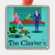 Ce couple rétro avec l'ornement de Noël de chien ressemble à une scène d'une comédie romantique. Le style des années 1960, le design minimaliste de l'art, présente un beau couple et vous invite à passer une soirée romantique chez vous. La salle sophistiquée est dotée d'un aqua et d'une cheminée en briques turquoises avec une corniche rouge vif. Une belle femme rouge vêtue d'une robe rose et brillante est perchée sur la corniche. Elle savoure un martini avec une olive flottante, un feu torride, une bonne musique, et la compagnie un homme grand, sombre et beau. L'homme porte un costume bleu et une cravate rouge. Son verre de martini est élevé pour trinquer son charmant compagnon. D'autre part, il tient un album vinyle. A ses pieds, nous voyons un dachshund des plus adorables portant un collier rouge. Le chien édulcorant se déplace en direction d'un joueur de disque vert aux pattes orange et fuseau. Au sol, il y a un groupe coloré de disques vinyliques amusants, éclectiques.Santé! Voici la soirée parfaite à la maison. Personnalisez ce vêtement de fête kitsch avec le nom du récipiendaire.