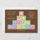 Cette invitation baby shower est conçue pour un baby shower en couple ou en coed. Des blocs de bébé en rose, jaune, vert et bleu apparaissent sur un arrière - plan chocolat. À l'intérieur des blocs sont une étoile, le coeur et la lune, ainsi que les lettres qui épellent le baby shower. Vous pouvez placer tous vos détails d'invitation baby shower en couple autour des blocs bébé. Copyright henishouseo