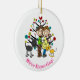 Un chiffre de bâton couple dans l'expectative, deux chats et un chien devant l'arbre décoré de vacances avec un secteur qui nous lit "prévoient !" dans le rose. L'ornement de retour a un anneau rouge de coeur avec le texte que vous pouvez customiser avec Noël d'année en cours !