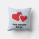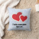 Un coussin carré avec une illustration de la Saint Valentin de 2 coeurs de papier rouge et un texte typographique qui dit : Je déteste tout le monde sauf nous. Placé sur un arrière - plan en marbre bleu glacé.