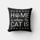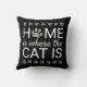 Ajoutez un style élégant à votre décor de maison et soyez à l'aise avec ce coussin graphique mignon et amusant avec les mots "maison est où le chat est" dans la typographie de script moderne, y compris un empreinte de patte de feuille gris argent métallique pour le "o" dans "maison" et des empreintes de pattes marchant sur un arrière - plan noir.