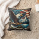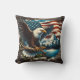 Un aigle puissant perche sur une branche avec un drapeau américain, entouré de montagnes et d'arbres sous un ciel clair.