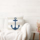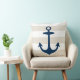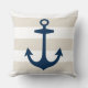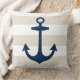 Un design élégant et chic d'oreiller carré accentue un motif côtier de larges rayures de cabane blanches avec une ancre de bateau bleu marine. La couleur de fond beige peut être personnalisée.