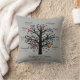 Garde de famille Jetez l'oreiller, l'arbre noir avec les noms et les dates, ajoutez le nom des parents et la date du mariage dans le tronc de l'arbre. Huit oiseaux dans l'arbre, avec place pour ajouter des noms et des anniversaires pour jusqu'à huit enfants ou petits-enfants. Le dos du Coussin a le même arbre noir, et sous l'arbre, le texte suivant : Le début d'un nouvel arbre généalogique. Noir sur coussin gris.