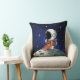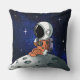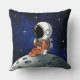 Illustration fantaisiste d'un astronaute de bande dessinée mignon, astronaute assis au-dessus de la lune. L'astronaute porte une combinaison orange, des gants blancs et un casque blanc avec une visière noire. Il a un badge en haut de son bras et des cadrans et boutons sur le devant de son costume. Sur son dos est un sac à dos pour son air. Il a un bras sur son côté et l'autre penché vers son casque pour lui donner l'air de penser. Ses jambes sont tendues devant lui. Il est assis au sommet d'une lune grise/blanche qui a des ombres et des cratères. L'arrière - plan est une galaxie noire et bleue aux étoiles brillantes et blanches scintillantes.
