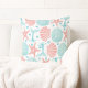 Apportez une petite plage à votre décor intérieur avec cet oreiller en coton à base d'étoiles de mer, de queues de baleines, de vagues, de coquillages de sable et de coquillages de pétoncles dans les tons coraux et bleu mer.