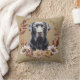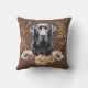 Un beau portrait d'un chien noir Labrador Retriever est placé au centre d'une couronne d'automne dans les tons brun cannelle, bronzé et crème. Le dessin du chien et de la couronne est placé sur un arrière - plan brun plus clair. Les deux côtés du coussin ont la même image, mais l'envers a un arrière - plan brun foncé.