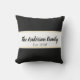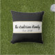 Ce coussin noir et blanc peut être personnalisé avec votre texte fait sur commande tel qu'un nom de famille en manuscrit noir. Le texte paraît sur une grande rayure blanche qui va à travers le centre. Sous le nom de vous peut ajouter l'année où la famille a été établie ou suppression. Une ligne mince d'or de faux (pas aluminium) est au-dessus et au-dessous du texte.