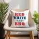 Le design élégant du 4 juillet coussin de vacances présente un design amusant de typographie "Rouge Blanc et BBQ" dans les couleurs rouge, blanc, bleu, marine avec des accents d'étoiles. Un bleu marine coordonné avec un motif étoilé blanc apparaît à l'arrière.