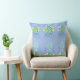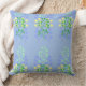 Bleu floral vert et Motif jaune. Des fleurs de différentes couleurs. Dessin de Krista Peacock. Le dos du coussin est bleu ciel.
