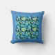 Un Oreiller à Throw ou un Coussin avec un motif abstrait "Blue Moons" en bleu vif et vert néon sur un arrière - plan noir, bordé par un motif Polka Dot coordonné. Une partie de la collection Posh & Painterly 'Blue Moons'; d'un collage de papier peint à la main par Judy Adamson.