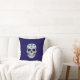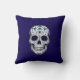 Un coussin avec une tête de mort souriante de couleur bleue et gris sur fond bleu nuit. Pourquoi une tête de mort colorée ? Pour exprimer une forme de sourire à la vie avec une tête de mort.