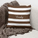 Un coussin design et unique en forme d'oreiller à lancer avec un design motif rayé brun et blanc et une impression personnalisable de nom blanc sur le côté avant.