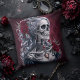 Cameo crânien femelle à oreiller à lancer rouge. © Dark Heart Desires. Un oreiller gothique jeté en rouge avec une camée d'un squelette féminin aux cheveux argentés orné de bijoux et de roses.