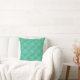 Les carrés en bleu et vert sont bordés de vert clair, une ligne verte plus épaisse qui se croise au milieu des carrés. Les lignes vertes se tissent sous les contours des carrés. L'Arrière - plan est en bleu. Un carré vert solide est situé à côté d'un carré en triangles vert clair et bleu. Le dos du coussin est bleu foncé.