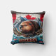 Un castor canadien construit un barrage près d'une rivière entourée de montagnes et d'arbres, avec un drapeau canadien en arrière - plan.