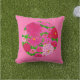 Coussin dans une illustration détaillée de chrysanthèmes fuchsia et rose douce sur un arrière - plan vert
