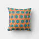 Cet oreiller de lancer a un design moderne du milieu du siècle de cercles orange ouvert avec des cercles turquoises solides qui traversent le motif avec des lignes verticales turquoises et des lignes horizontales orange.