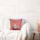 Un mignon chat tabby en caricature gris et blanc pond sur un coussin couleur grenat avec oeillets roses à proximité.