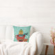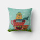 Un coussin de noël avec l'image d'un adorable chat orange assis dans une tasse. Portez des vêtements chauds d'hiver. Les flocons de neige tombent contre un arrière - plan vert clair. Bordure d'arbre de Noël le long du fond.