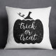 Célébrez l'Halloween avec style avec cet oreiller saisonnier "tour ou gâter" avec des lettres de script modernes sur un citrouille rustique noir texturé.