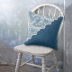 Ce joli coussin a une image de dentelle blanche oeillet recouvrant un coin. La motif dentelle est composée de petites fleurs et de feuilles. Il est placé sur un arrière - plan bleu moyen. Le dos du coussin a la même image. * Veuillez noter que l'image dentelle est imprimée sur le coussin.