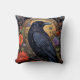 Coussin avec un corbeau noir. Une arche jaune derrière. Entouré de fleurs rouges et violettes. L'ambiance gothique cool.