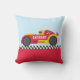 Un oreiller à lancer avec l'illustration d'un conducteur dans une voiture de course jaune et rouge avec à damiers éléments de race noir et blanc. Idéal pour les enfants et les garçons qui aiment les voitures de course et la vitesse !
