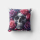Illustration détaillée d'un crâne humain orné de roses roses et violets vifs, symbolisant un mélange de beauté et de mortalité, dans un cadre artistique abstrait.