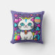 Adorable coussin avec un mignon chat kitty caricaturé blanc, fantaisiste, avec de grands yeux bleus, des oreilles roses et portant un collier brillant et coloré. Elle a une jolie queue rayée bleue, rose et blanche et une bande bleue sur la tête. L'arrière - plan est principalement violet avec des planètes, des nuages, des étoiles et des fleurs dans un mélange de couleurs audacieuses, vives et vives. Idéal pour tous ceux qui aiment les chats et l'espace.