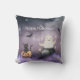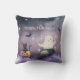 Un mignon chat noir dans une lanterne de valet et un mignon fantôme amical dans un chaudron vous saluent Happy Halloween tandis que des étoiles, des chauves-souris et une brume violette les entourent.