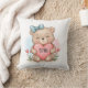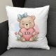 This adorable personalized nursery throw pillow features a watercolor teddy bear wearing a blue bow, happily hugging a glossy pink heart, and sitting among gentle flowers that show love and warmth.