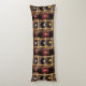 Ce coussin contemporain de corps comporte un motif abstrait de répétition d'une bouteille rouge et noire droite de vin de Bourgogne à côté de trois bouteilles supplémentaires dans un brun, un or et un support en bois jaune de vin. Un arrière - plan orange rustique de mur de briques accomplit la composition.