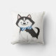 Aimez-vous les chiens ? Ce coussin doit être dans votre espace alors. Un mignon chien noir et blanc aux yeux bleus vous fera dire, "awww". Il cherche aussi du papier dans sa cravate à arc rayé bleu et blanc. Le dos est fait dans une couleur bleue solide.
