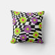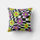 Quel accent super ce coussin fera pour votre canapé ou votre lit. Jetez un oreiller avec des fleurs funky dans les tons vert citron , joli violet et rose chaud, contre un arrière - plan abstrait à carreaux noir et blanc.