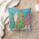 Coussin des arbres de Noël, des arbres de Noël dessinés à la main et des neiges. Devant du coussin est 4 arbres capricieux en turquoise, vert, rose et crème debout sur des montagnes de neige avec un arrière - plan neigeux bleu. Le dos du coussin est un arbre vert solitaire dans la coordination des couleurs. L'avant du dos du coussin est numériquement signé par l'artiste : g.gabel. *Tous les graphismes de Gail Gabel, artiste.