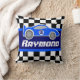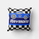 Coussin original de chambre à coucher d'enfants de graphique pour des garçons. Perfectionnez pour une chambre à coucher dénommée de emballage de garçons bleus. Comportant une voiture de sport de bleu sur le graphique a quadrillé des rayures de drapeau. Customisez avec le nom et le nombre de votre choix. Lit actuellement Raymond. Graphique uniquement conçu par Sarah Trett.