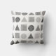 Cet oreiller de 16" x 16" est doté d'un cercle dessiné à la main, de triangles et de carrés dans des tons gris sur un arrière - plan naturel.