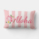 Le design coussin tropical présente un motif de rayures de cabane verticales blanches de couleur arrière - plan rose pâle (à customiser) et rose chaud "Aloha" en écriture avec fleurs d'hibiscus.
