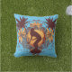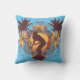 Ce coussin extérieur de fête comporte une silhouette d'une femme montant une planche de surf entourée par des palmiers et des fleurs tropicales"