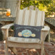 Laissez les astuces ou les traiteurs allergiques savoir que votre maison est une étape incontournable avec ce coussin porche extérieur sucré. Design propose un citrouille Jack-o'-lantern turquoise souriant flanqué de petites gourdes, avec "friandises allergiques disponibles ici" en lettres turquoises.
