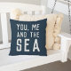 Ajoutez le style nautique cool à votre patio, votre maison de plage ou votre piscine avec notre oreiller extérieur jetez en bleu marine riche, avec la citation "vous, moi et la mer" en blanc cassé.